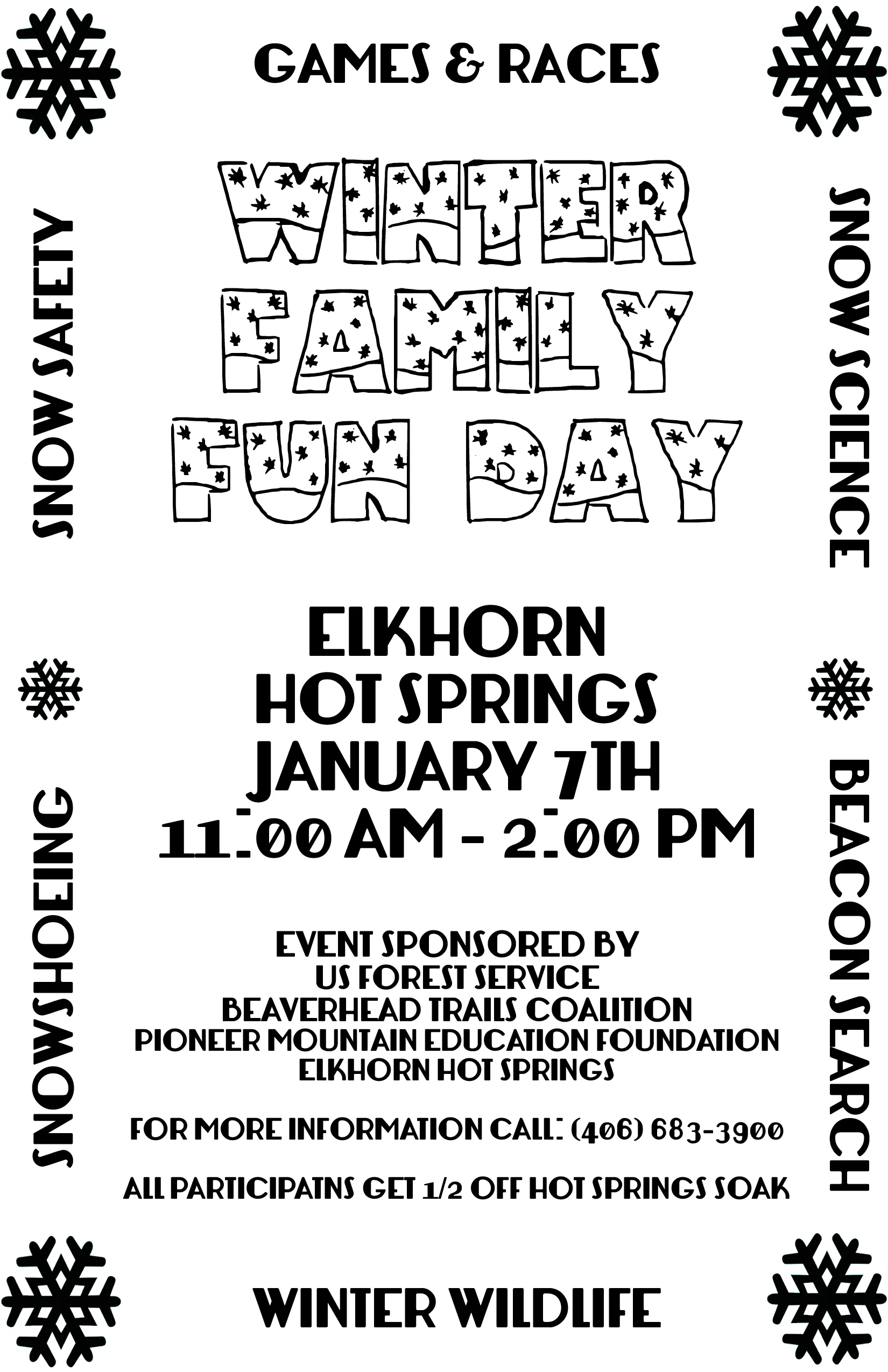Come join us for day of fun enjoying and learning about snow on our local forest. The Winter Family Fun Day is a great time to get outside and enjoy the snow as it piles up this season. Stop by Elkhorn Hot Springs on January 7 between 11AM-2PM to visit stations with everything between fun snow games and cool facts about snow. Stay afterwards for a trip around the ski trails or a 1/2 price soak at the Hot Springs.